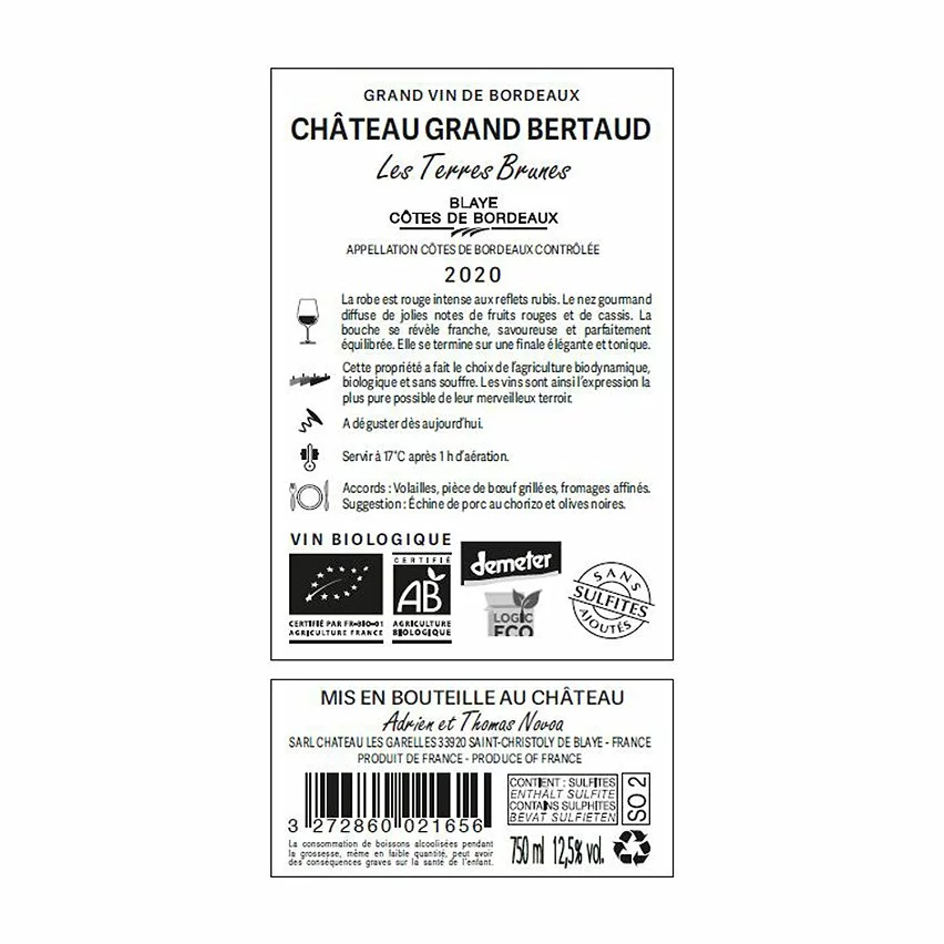 Acheter 🌟 Château Grand Bertaud Les Terres Brunes BIO, 2020 – Blaye Côtes de Bordeaux AOP – Rouge – 75 cl 😉