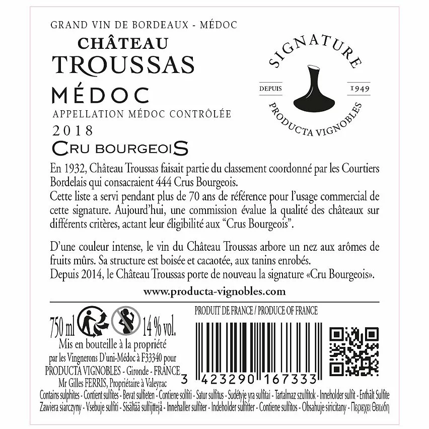Acheter đ„° ChĂąteau Troussas, 2018 – MĂ©doc Cru Bourgeois AOC – Rouge – 75 cl đ