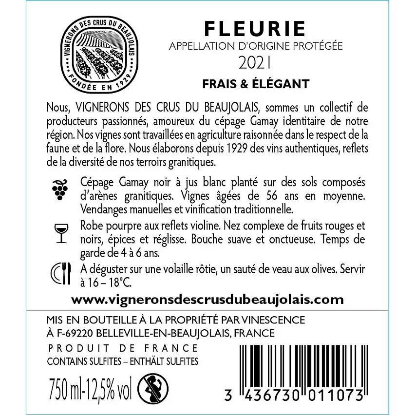 Offres ⌛ Vignerons des Crus du Beaujolais La Côte Sableuse, 2021 – Fleurie AOP – Rouge – 75 cl 🛒